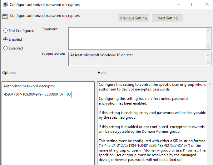 Below, you can see Windows LAPS configuration specifying who can decrypt the password.
