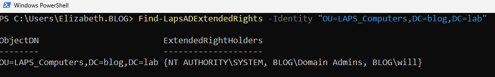 Find-LapsADExtendedRights -Identity "OU=LAPS_Computers,DC=blog,DC=lab"