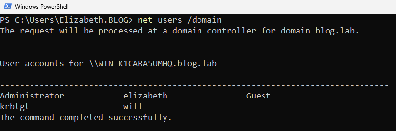 Additionally, by running the net user /domain command, we can observe that BLOG\will refers to a user.