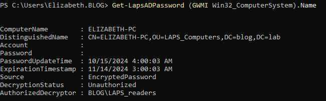 Get-LapsADPassword -Identity "elizabeth-pc" -asplaintext