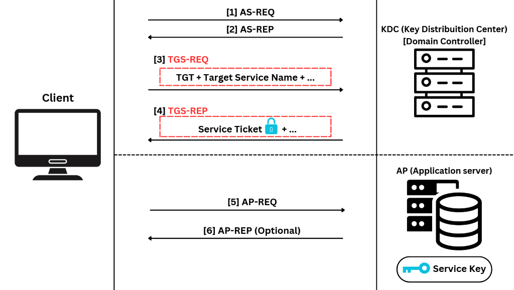 As illustrated in the diagram above, once the user successfully authenticates and obtains Ticket Granting Ticket (TGT) through steps [1] and [2], they can send a TGS-REQ to the KDC to request a service ticket for any available service on the network.
