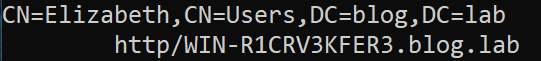 Examplary, we can have SPN tied to Elizabeth, which is a user account in domain blog.lab. The SPN is for HTTP service running on port 80 on device WIN-R1CRV3KFER3 from domain blog.lab.