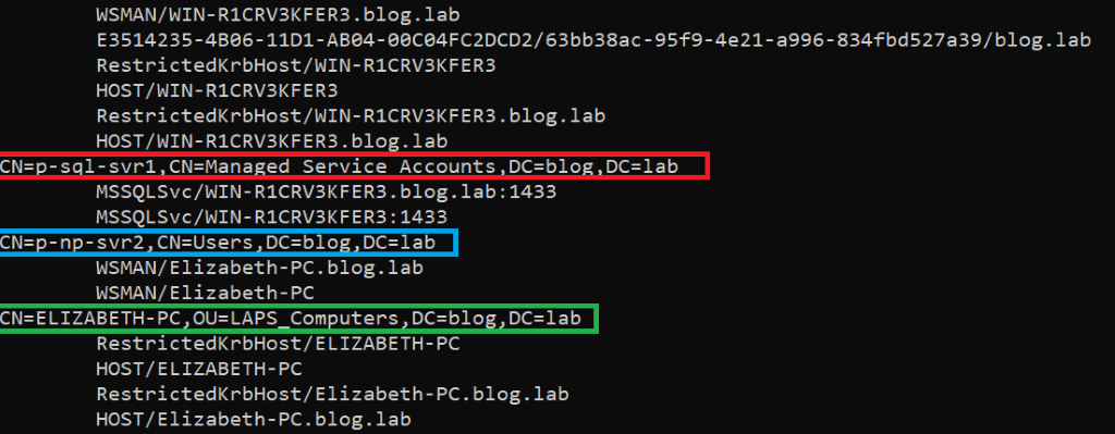 The red one is for Managed Service Account (MSA) 'p-sql-svr1' and MSSQL service (SQL Server) running on server named WIN-R1CRV3KFER3.blog.lab on port 1433.